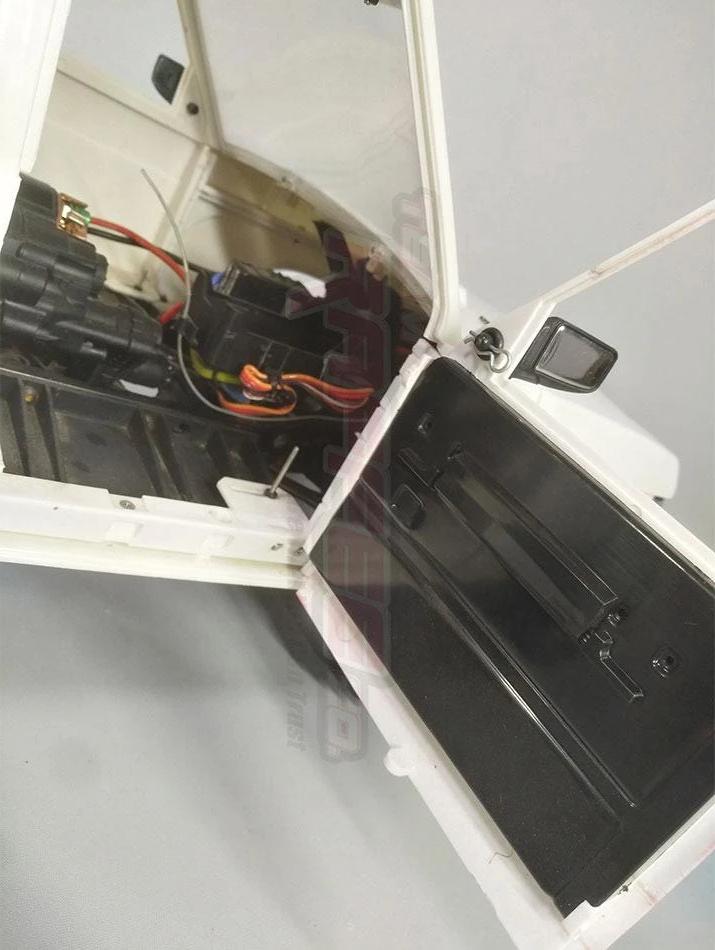 Front hood and doors on both sides open. Rear window and door open separately in two pieces.