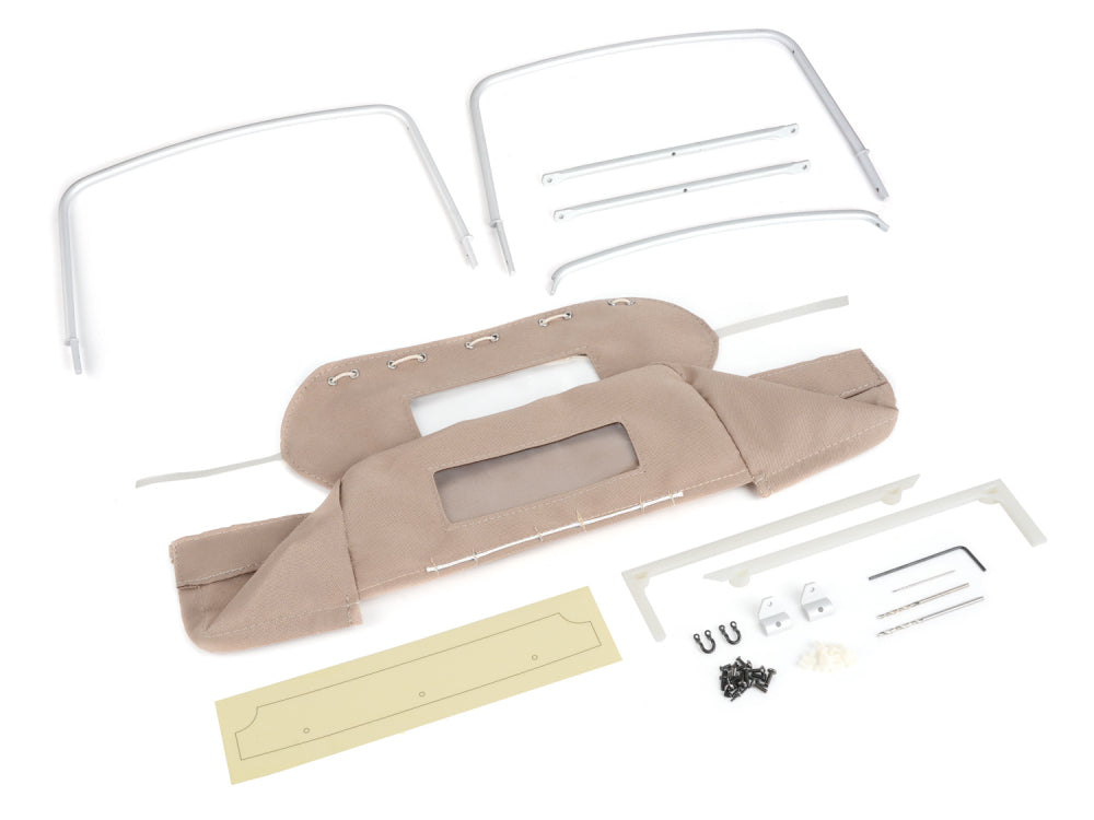 Download the instruction manual for the full hood installation. A video installation is available for the canvas soft top.This set includes:+ 3/4 Canvas Soft Top+ Aluminum 3/4 Hoop Set+ Hoop Set Mount+ Hoop Retainer+ Metal Rear Loop Tie Down+ Tie Down Cleat+ Hardware - Color: Sand