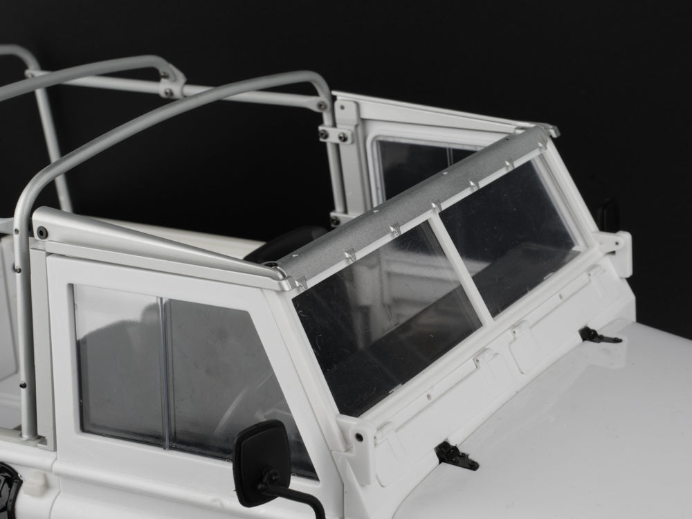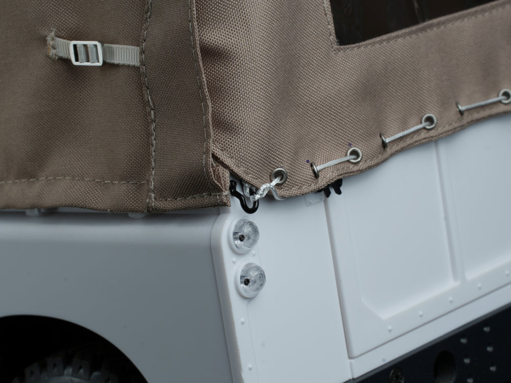 This is a KUDU™ Full Canvas Soft Top & Hoop Set for Series Land Rover 88.Designed for Land Rover Series 88, this KUDU Canvas Soft Top Set allows you to convert your vehicle into a fabric-top truck, maintaining an accurate scale look with a precise fit.Under the canvas is a full aluminum hoop set that includes the front and rear hood sticks, horizontal tie bars, door top and door post drain channels, and header rail.The canvas can roll up in the back with straps on top to secure it in place.Photos are for reference only, the body is separate and not included.
