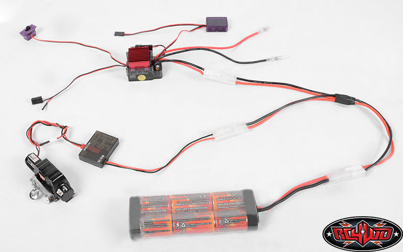 Shown installed with RC4WD 1/10 Warn 9.5cti Winch (Z-S1079), RC4WD Warn 1/10 Wireless Remote/Receiver Winch Controller Set (Z-S1092), Outcry Crawler Speed Controller ESC with TurboBEC (Z-E0007) and Battery for example (Not Included)