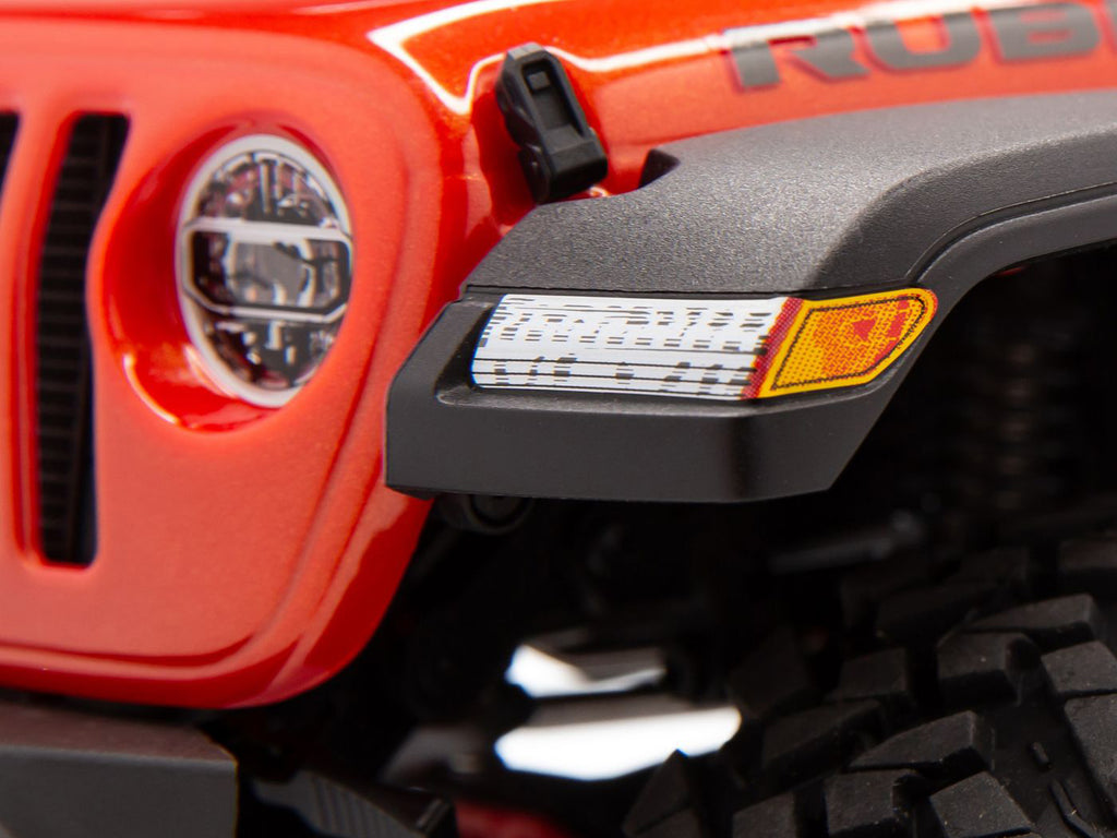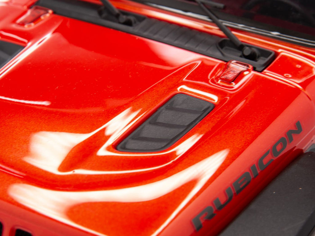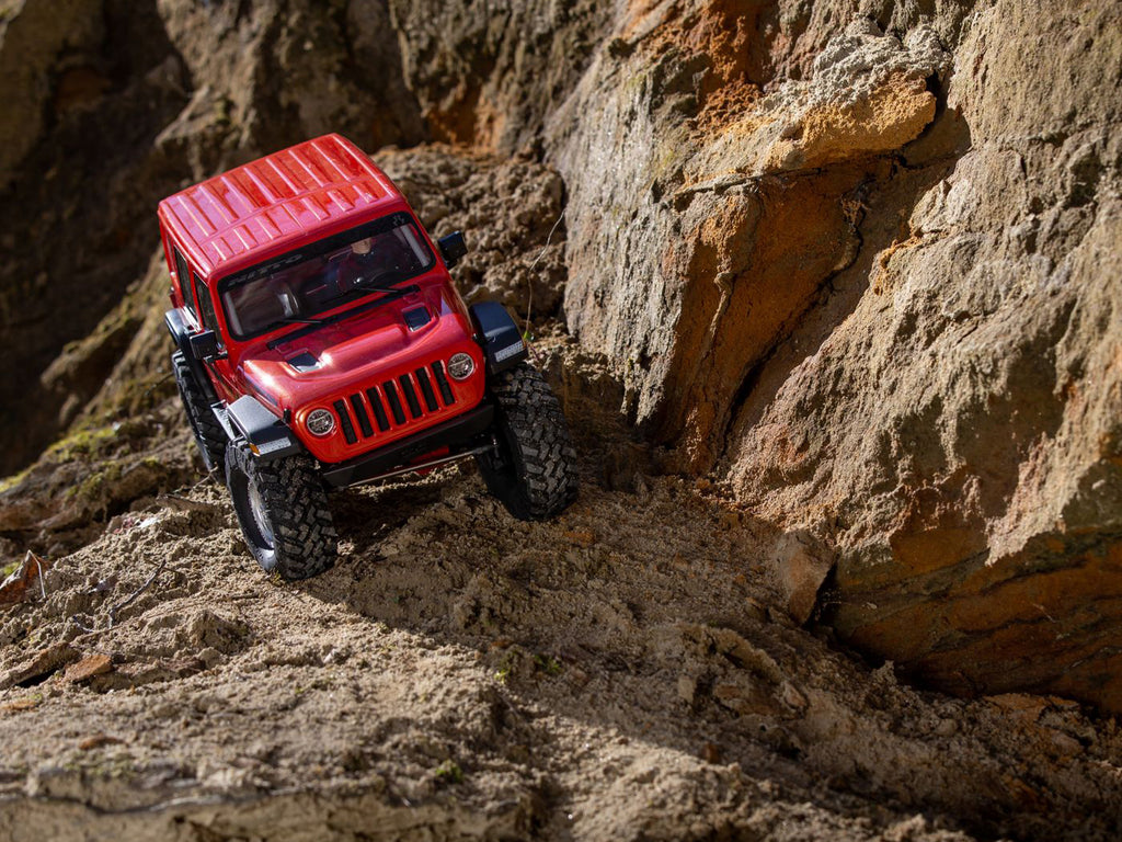 The chassis is topped off with a Jeep® Wrangler Unlimited four-door body that includes a roll cage, front hood vents and cowl, windshield wipers, mirrors, door handles and other moulded-in details, plus a detailed interior and LED lighting. New taller and wider, officially licensed Nitto Trail Grappler tyres on 3-piece beadlock wheels add more scale realism and more grip on dirt, rocks, and all other off-road trails.