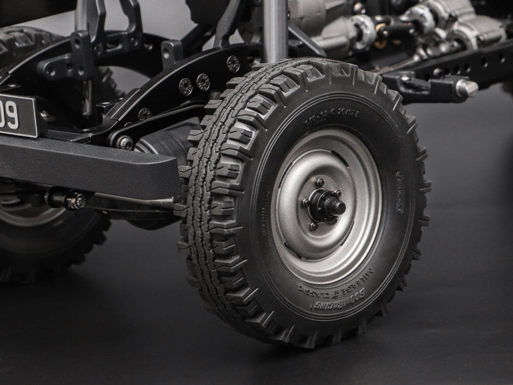 The chassis is fitted with our SLR™ 1.9” steelie beadlock wheels that come with scale wheel caps with a tool included for easy installation, as well as scale screws that were specifically designed for these wheels, with a tool included. The wheels are paired with a set of Mileage Classic™ 1.9” scale tires in Gekko™ Black (super soft) compound. This soft and tacky rubber is our proprietary compound which is used in many of our tires and is formulated for crawler performance and durability in rough terrains.